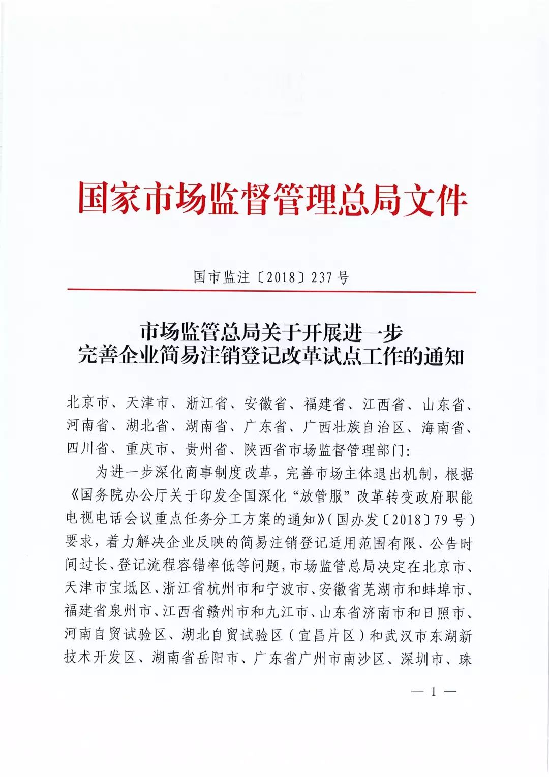 市場監(jiān)管總局關(guān)于開展進(jìn)一步完善企業(yè)簡易注銷登記改革試點工作的通知(國市監(jiān)注〔2018〕237號)